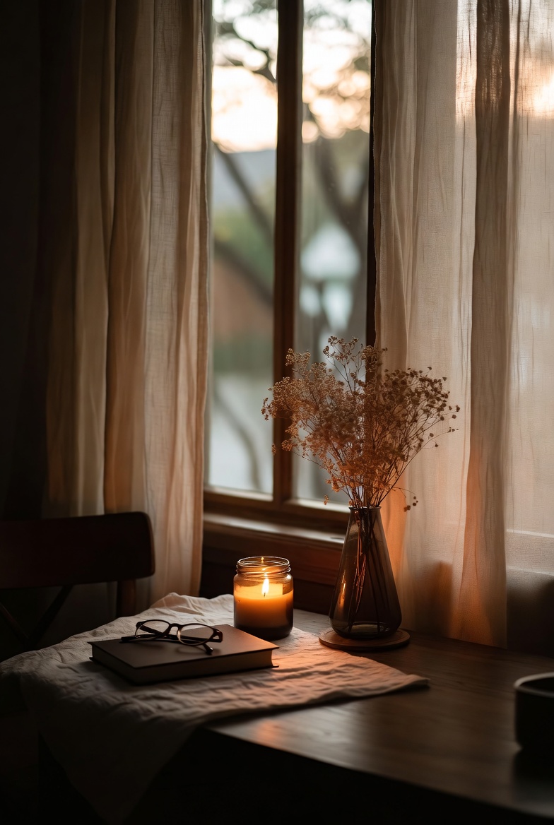 Mulailah dengan merapikan ruang sebelum malam tiba. Meja yang bersih dan lampu yang redup memberi kesan lebih tenang. Pencahayaan hangat membantu menciptakan atmosfer yang berbeda dari siang hari.